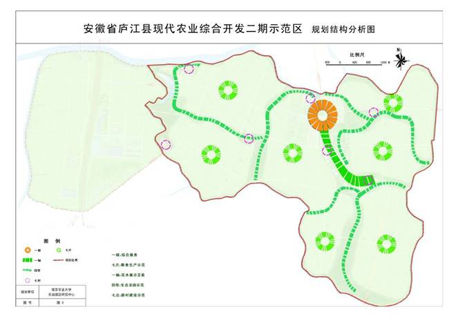 本次规划立足一期、做实二期、放眼三期,将示范区范围由一期向东扩展,涉及郭河镇的南圩、北圩、施湾三个行政村和同大镇薛家圩、新渡、施丰三个行政村,规划面积53206亩。本次规划继承一期规划理念,但更强调服务功能的完善与配套,以建设秀美庐江、生态粮仓为目标,构建市场交易服务平台、加工物流服务平台、农民创业孵化服务平台、农业观光服务平台,探索以三产带动一产和二产,以物流服务、创业孵化和科技示范带动全县产业结构调整和农民增收的途径。